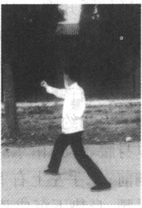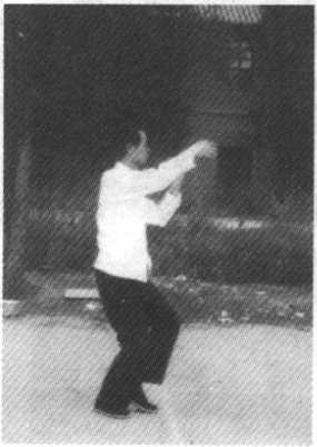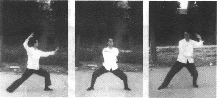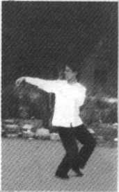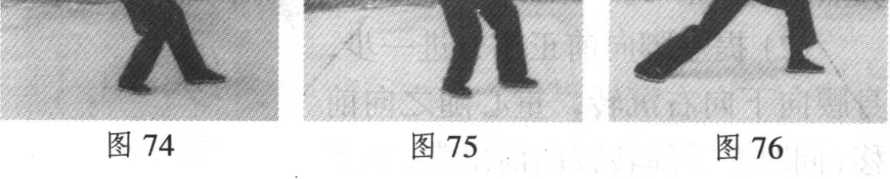 (1)重心前移左腿,右脚提起,向前进半步,落于左脚 之后,踏实,重心又由前向后移右腿,左脚向后收回,以脚 前掌虚虚点地于右脚前,同时右手小臂外旋,掌心向左, 随身势后坐向后微向上收回,左手随动,护于右臂肘关节 处,此时双膝微屈,身势向正东,目视前方,如图77。