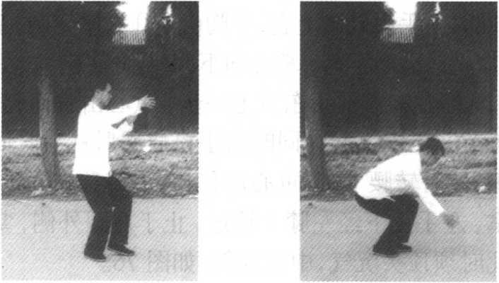 (2)双腿屈膝,重心下沉;身势下蹲,以全身松沉劲下 踩,双手随动,目视前下方,身势向正东,如图78O