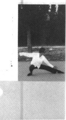 (2)提左脚向前正东方进一步, 身腰向下向右沉转,重心随之向前 移;同时左手随转腰向前出掌,右手