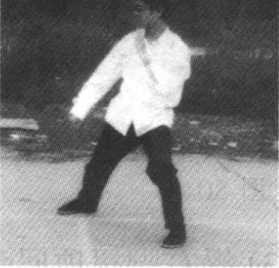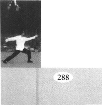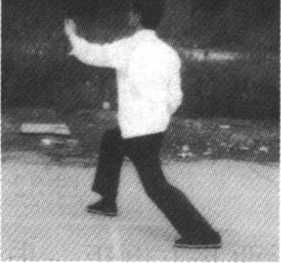 (4) 身势向右转腰松沉,重心前 移,右拳随转随沉往后屈肘抽挂,止 于右腰侧,左掌随转身腰向西北方 横掌送出;此时身腰已转向西北方, 目视左掌前方,立身务必中正,不可 前俯后仰,如图84o