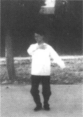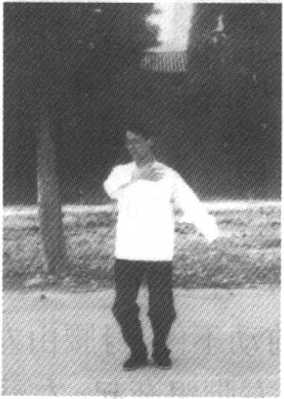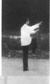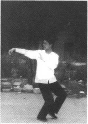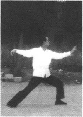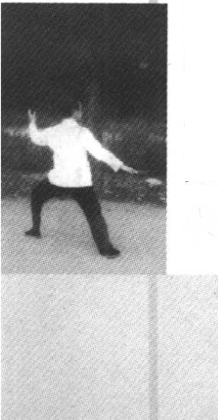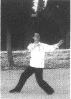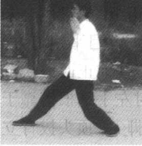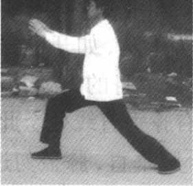 (3)撑掌 提左脚向正东方出一步,身势微起往前下