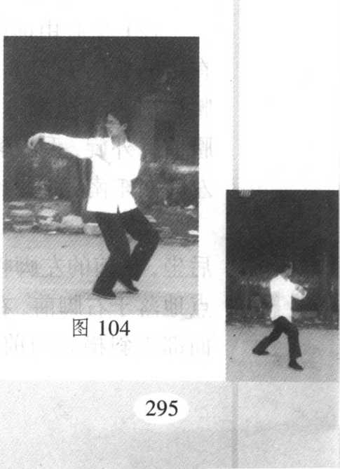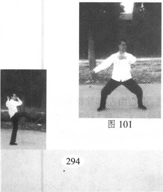 图98(3)撑掌 提左脚向正东方出一步,身势微起往前下