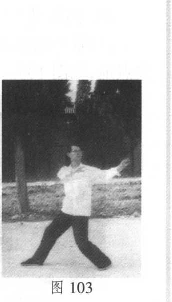 松沉,重心前移,同时左手经胸前往前正东方出掌。此时 左掌向正东,右钩手向正西,胸腹侧身向正南。身势勿扭 曲,顶头拔背,开胸沉气,目视东方,如图99。