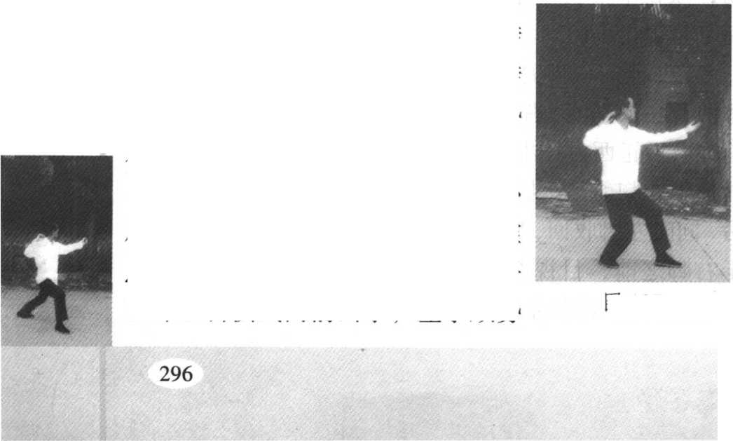 (1)带 前动不停,身腰向右沉 转,重心渐移右腿,左脚跟渐起,右 臂从胸前继续向右云转,转至身右 侧正西,掌心向下;同时前动落于 身左侧的左臂随转腰,经裆前向右 挂移,从身右侧上起,两臂高度同 肩相平,掌心向下,然后提左脚向 左侧倒退一步,向左转身腰脊柱, 边转边坐重心于左腿,随身腰转 动,双臂节节贯串由正西向左后东 南平带,如图103o