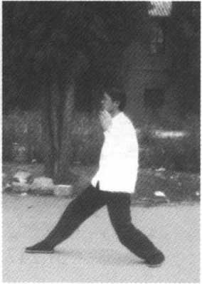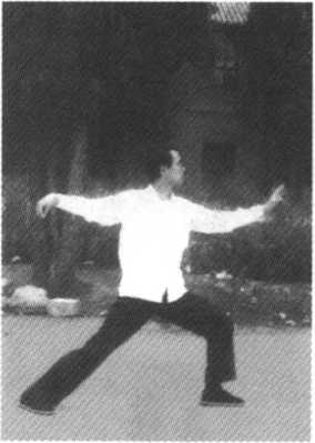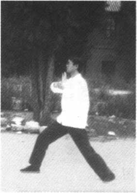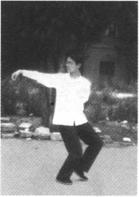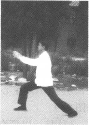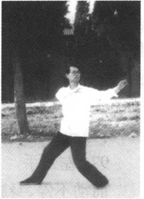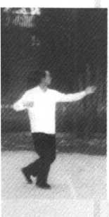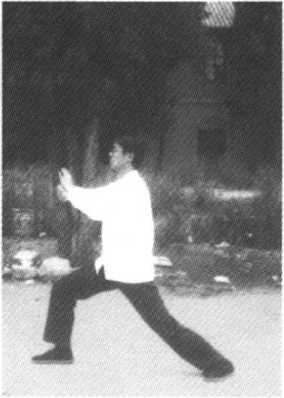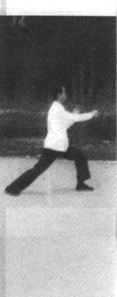 (3)挤 以腰脊领动,身势徐徐上起转向正西;同时 左手经后划一圆弧,沉肩垂肘指尖向上,掌心向前,竖掌