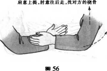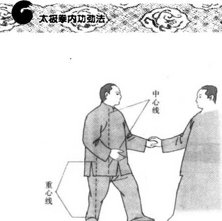 由胸部至会阴的一条直线为中 心线(又称前线);由尾闾至足跟的一条直线为重心线(又称后线)。与对方搭上手,要在接触处以按劲向对方前线的上端(对方胸前十字 中心)按去。同时,内劲由劲源沿下线0 通出催向按劲,并以按内劲逼问出对?W55方中心线的反应劲点,即擦着反应劲 点的下线往其会阴处发去,对方即跳 跃而出。也可通过接触点向对方的尾闾 按去,内劲由劲源仍沿下线催向按 劲,待对方后线有反应后即向对方足 跟绷去,使对方被绷发跳出。(图55)