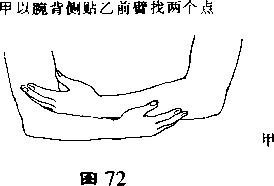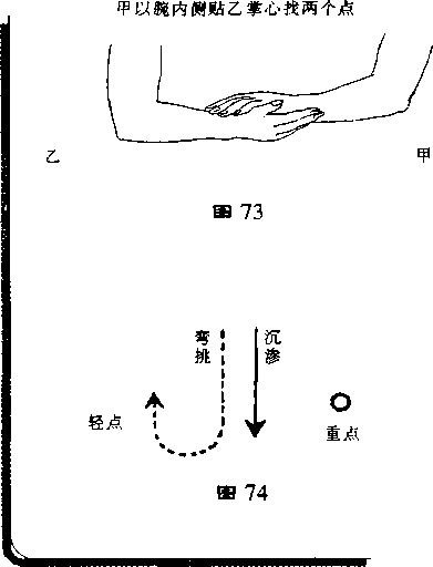 无论手心向上或向下与对方接 手时,都要用腕部贴向对方掌心或前 臂(图72、73)。若腕部贴扶在对方前 臂上,就在接触处找一个力点和一个 轻点(先找哪个点都可)。找点时,不 要用腕部向前压或向后沉,而是意想 出现两个点;我之内劲通经前臂似流 水般向两点之间的缝隙中沉渗,再顺 ■ 着沉渗劲的流势而轻轻地向前上挑 时起,将对方发出。(图74)