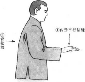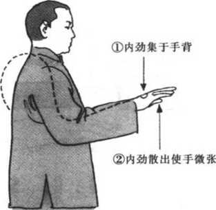 随即内劲由劲源发出,经肩臂之 上线通至手上并集于手背的中指根