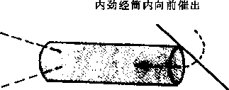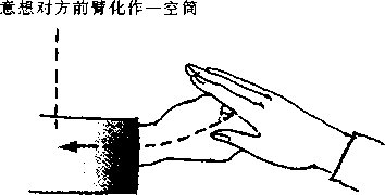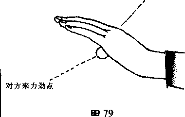 与对方接触时,手要侧接其来 手。意想对方前臂化作一个空筒,接 触点便是空筒口,不要向手按的空筒BB 77BB 78边发劲,要以意领内劲绕过筒边钻入 空筒口,使内劲顺着空筒向前催出以 发放对方。(图77.78)以重劲渗入对方来力