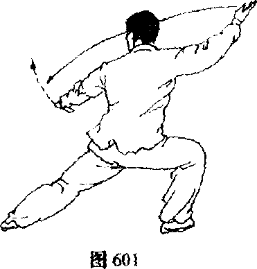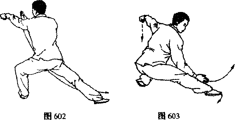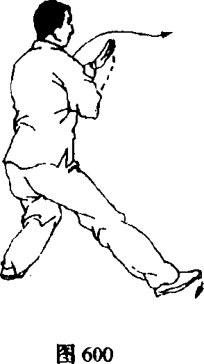 3 .上体微右转,右脚向右侧开步,脚跟落地。目视左掌 (图 600) o