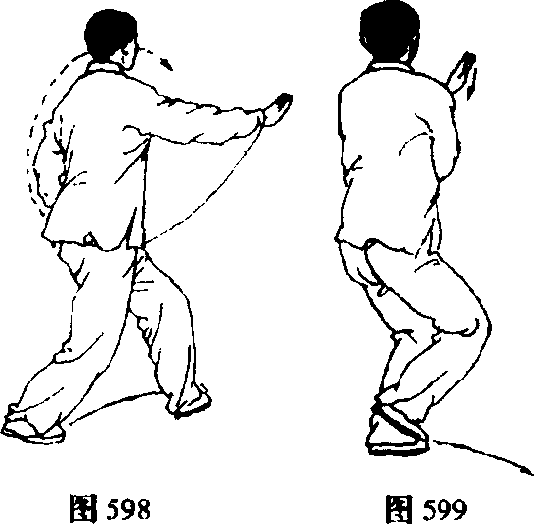 转,右脚跟稍外展;左掌变勾手,提至身体左侧,腕与肩同高, 右掌向左划弧,经头前摆至左肘内侧°目随右掌(图602)。