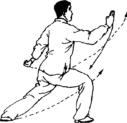 1 .重心右移,上体右转,右脚尖外展,左脚尖内扣,右腿 屈弓,左腿自然蹬直;右掌向上挑至体前,成侧立掌,腕高与肩 平,左臂内旋下落至身后,勾尖向上。目视右掌(图604)。