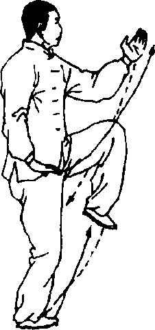 姿势。提左膝与左掌上挑、提右膝与右掌上挑要协调一致;同 时,右掌在右胯旁,左掌在左胯旁要有一按劲,这样才能站得 稳。