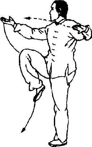 要点:此动作左腿独立时,膝要 微屈。用右掌翻转上托劲与左掌在体 侧的外撑劲来维持身体平衡。眼看体 前右手,意念着于后面的左臂,这样才 能站得稳。