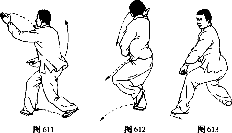 1 .右脚前落,脚尖外撇,重心前移,上体右转;右臂内旋,右 掌翻转下捋,左臂外旋,左掌向上、向右划弧。目视前方(图611)。