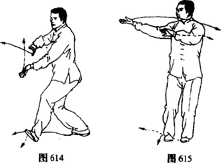 1 太极拳普及读本太极拳普及读本.重心后移,左脚尖外撇抬起;左拳变掌,左臂外旋,右 臂内旋,两掌心同时转向外,并微向后收带。目视两掌(图 614) 0