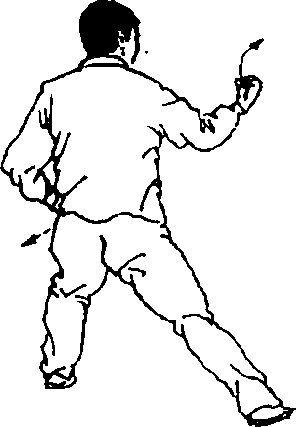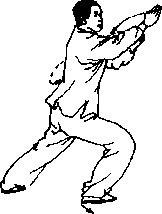马步,重心仍偏于右腿。利用身体重心下沉及右臂向前挤靠, 形成向左前方的靠劲。上体下沉,右腿屈膝半蹲时,应注意敛 臀,上体保持正直。