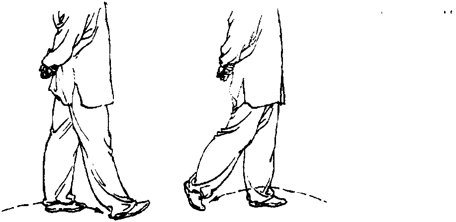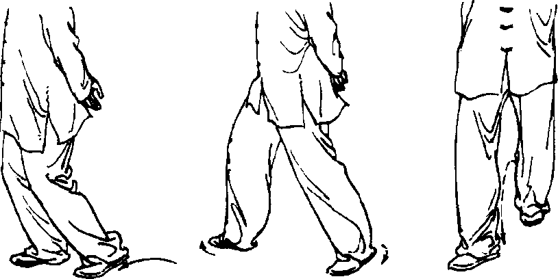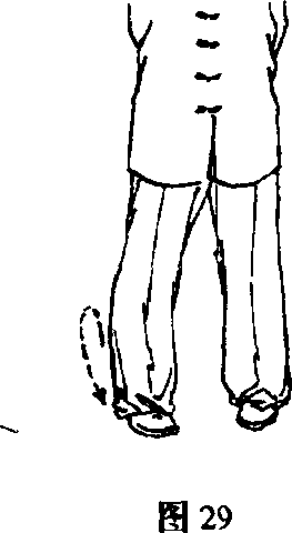 3 .扣步:一腿支撑,另一腿提起,小腿内旋,脚跟先着地, 脚尖内扣而后全脚着地(图29)o