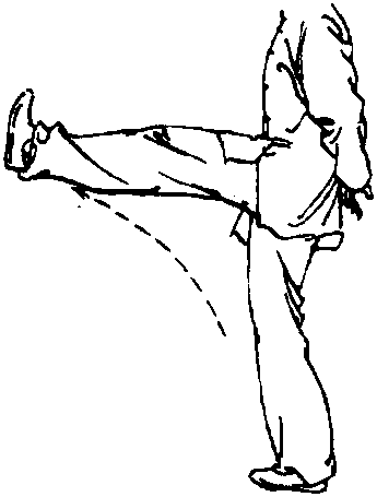 蹬脚:支撑腿微屈,另一腿屈膝提 起,脚尖上翘,以脚跟为力点蹬出,腿 自然伸直,脚不得低于腰部(图33)。