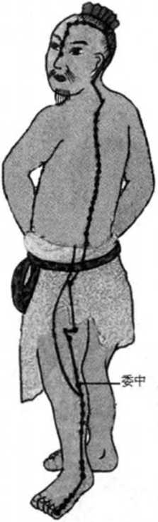 行先后通过环跳穴、委中穴抵达足跟继至涌泉穴。