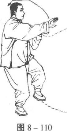 3. 迈步撇拳 重心在左脚上,身体右转,右胯开,膝外旋, 右脚向前稍偏右迈出,脚跟着地,同时,右臂外旋,继续向前弧形 撇出,拳心向里,与胸同高,左掌由右小臂外,稍向下向里向上划 半弧,置于右小臂里侧,目平视顾及两手动作(图8-114)o