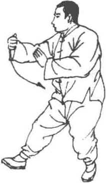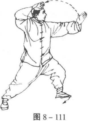 1. 扣脚握拳 左腿承担重心不变,左脚尖里扣灾度踏实, 左胯根微收,身体右转,同时,随转体,右肘下沉,右掌渐握拳由 上向下、向右划弧置于左肋前,屈肘横臂,拳心向下,左掌弧形上 举至左额前上方,目随视右掌,后平视前方(图8-112)。