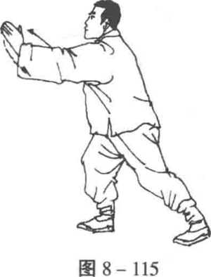 4. 弓步推掌 重心渐移于右腿,右脚踏实,弓右腿,蹬左 脚,左脚尖稍内扣,成右弓步,同时,右肘下沉,右拳回抽收于腰 间,拳心向上;左掌由胸前经右臂里侧上方向前推出,掌心斜向 右,指尖向上,目视前方顾及左掌(图8-115)。