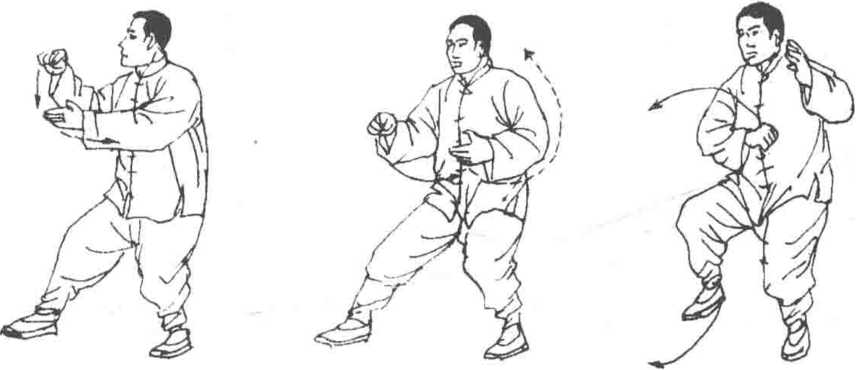 1 .坐腿伸拳 松左膝屈腿,重心逐渐移向左腿,身体微向