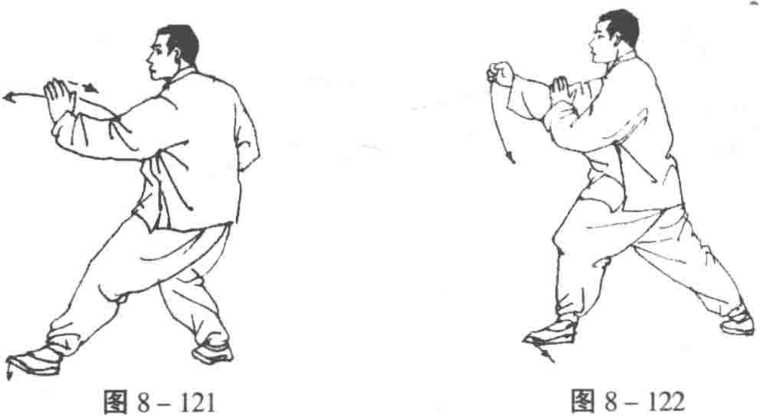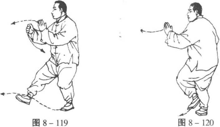 以下动作与第十二势“进步搬拦捶”动作3、4、5相同,惟方 向不同(图8- 119?122)。