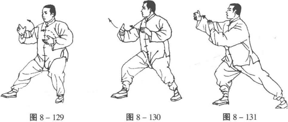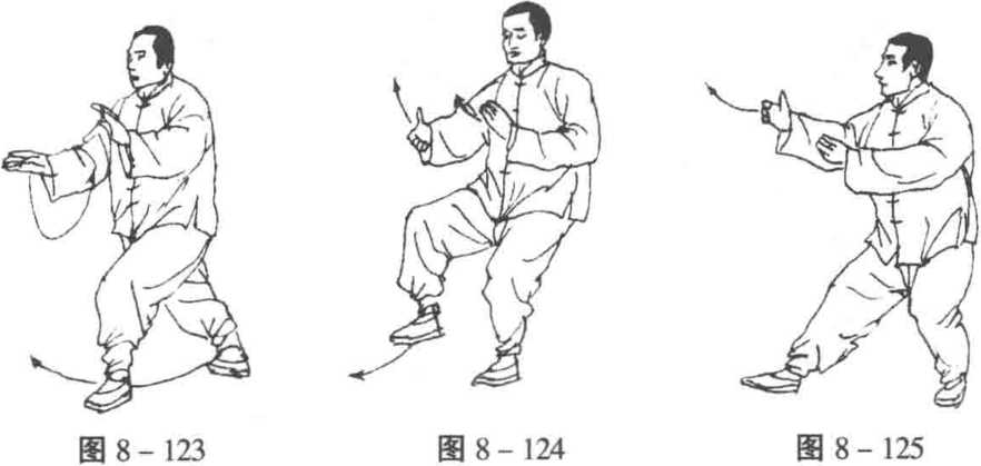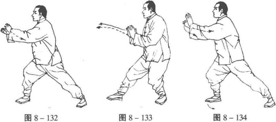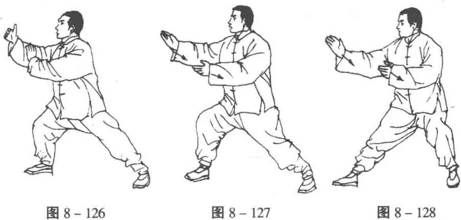 以下糊、撅、挤、按的动作与第三式“揽雀尾”——即自左右 棚式动作4起至按式止——相同(图8-124?134)。