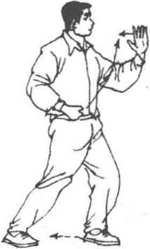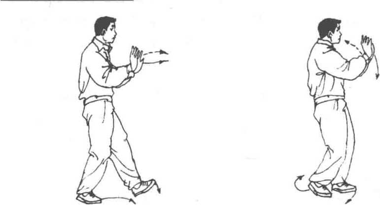 ④ 左腿前弓时,两手与两肩要有凑合相吸的“引”、“蓄”之 势;两手前推时,要有沉着之意,身体不可俯仰。