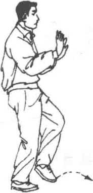 3. 迈脚上步 重心仍在右腿,左脚向前迈步,脚跟着地, 脚尖上翘,两腿仍为右实左虚,两手不动,目前视(图9-33)。