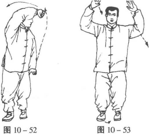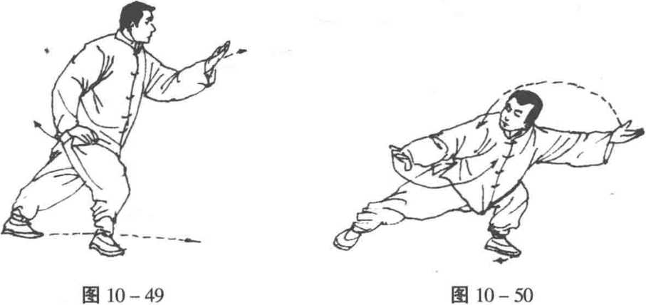摆,同时,左掌向左前方伸出,掌心向上,右掌向后下方按出,目 视右手背(图10-50)o