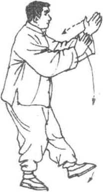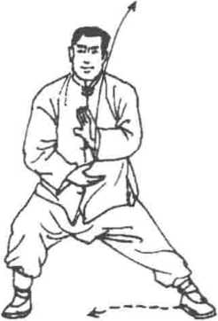 下肢不变,身体略向右转,右掌稍后移,左 仰掌向上耕出,上身微前倾,目视前方(图10- 重心移至右脚,左脚由后向前经右腿内侧, 脚尖微内扣,屈膝弓腿,右腿自然仆直,脚尖外