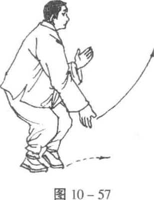 2. 虚步插掌 重心仍在右脚,右腿屈膝下蹲,左脚尖点地, 成左虚步,上体微前倾,同时,左掌收于右肘旁,右掌向斜下方插 出,目视前方(图10-57)。