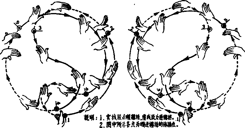 ② 所谓由内往外翻或由外往内翻,皆以食指的翻转为标准。如图1中,手从 点1到点2,此时食指的运动系由内往外翻,故为顺缠;手从点2到点3,食指的运 动则为由外往内翻,故为逆缠.