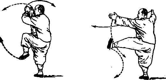 以上各式,在踢脚或者蹬脚之前,都有握拳上举的动作,请 记住:凡在踢(蹬)左脚总是左拳在外、右拳在里,踢右脚总 是右拳在外、左拳在里。以后还有踢脚动作,仍要这样。
