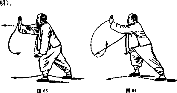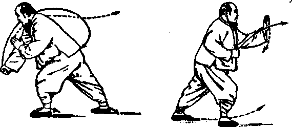 上面一二两动作,为便利初学,故按照搂膝拗步的式子分 别图解,练熟后,应当作成连续搂膝上步的式子,将左右手的 前推动作略去。