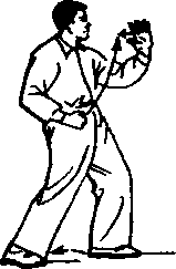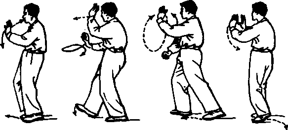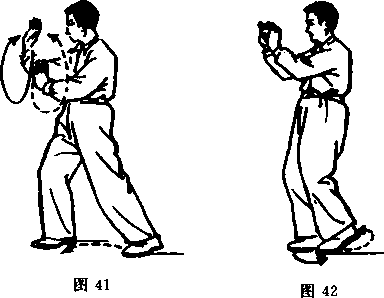 动作三、四与第三式“右懒扎衣”动作三、四相同,惟方 向略异,本式是面对正西方向。(图41—42)