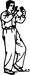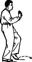 动作一:左足后退踏实,足尖朝西南斜方,右足收至左足 前,以足尖点地,两腿变为左实右虚;两手随身左转,立掌收 回至胸前,右手仍与口平,左手落至腹前,两手心均稍朝前;面 对正西方向。(图39)