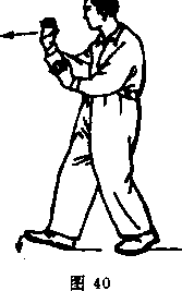 动作二:右足向前迈出,足尖上翘,以足跟着地,右腿微 屈,两腿仍为左实右虚。(图40)