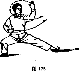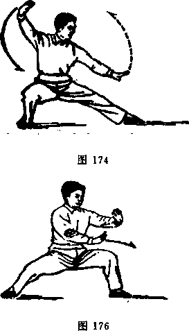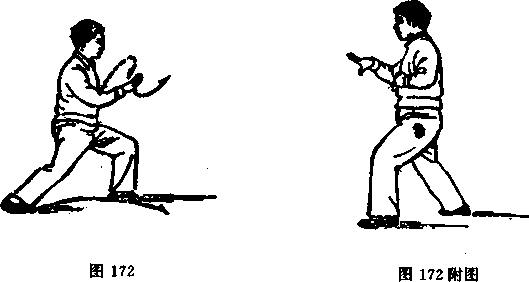动作一:身体右转。同时,右拳变掌大逆缠、屈肘,掌心 朝下,虎口张开;左掌自左胁侧小逆缠至胸下(图172,附图172 的另一侧侧面图)。右脚脚尖外撇向前上步;同时,右掌向前顺 缠翻掌使掌心朝上,左掌顺缠交搭于右小臂上(图173,附图 173)。紧接着左脚向前上一大步,脚尖微里扣,仆腿;同时两 掌逆缠翻掌,右掌向下、左掌向前下分开以掌根突然削出(图 174) o