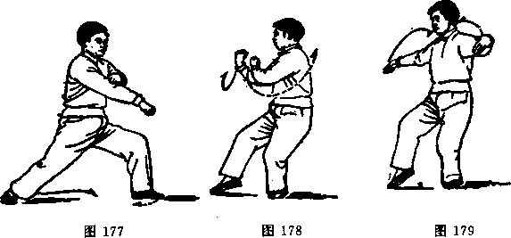 动作一:身微右转。同时,两掌变拳,右拳转臂逆缠向前 下伸,拳心朝下;左拳逆缠自左下收回,划一小圈合搭于右臂 上,拳心朝下;重心仍在左,弓左腿(图177)。重心移于左腿, 以左脚跟为轴,身体向右后转,右脚里收半步,以脚尖点地;同 时两拳小顺缠在胸前合住劲,拳心皆朝里上(图178)。两拳变 掌以双顺缠紧缩交叉圈后下落,即转臂为双逆缠,各左右分开, 将要达到终点时转为双顺缠,以手背放劲,两掌心相对,右脚 尖仍点地(图179)。