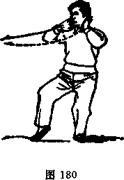 动作二:身体左转;同时,两掌随转体微向左转,两肘下 沉,两掌即以右顺、左逆缠收回至两耳旁,掌心朝两颊;同时 重心再稍左移,仍以右脚尖点地(图180)。右脚前迈半步,随