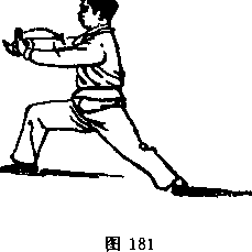 着重心前移,右腿屈膝变实,身体右转;同时,两掌自两颊旁 向右微下落,即随转体双顺缠向前推出;注意两掌小指,掌心 朝外(图181)。