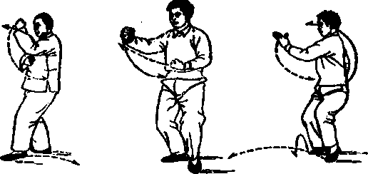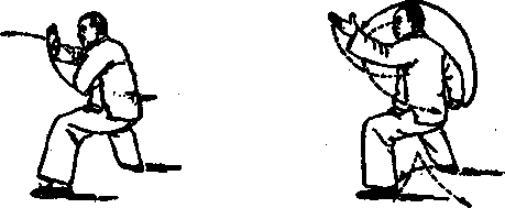 动作:在上式裹鞭双开的发劲之后,右足向右后、与左足 相平作同宽度的弧转90。。然后左足向左后挪转半步,转过身 躯。同时,上部以右拳顺缠由外而内地划弧,转到左肘之下,拳 心向内。左拳逆缠,由外下而内上地竖起,拳心向右,形成双 合之势。其时,右足实。(图62)接着将竖起的左臂,在顺缠中 向左横坠,从右向左后为宾地一放劲,同时左足向左后退步,仍 以右腿为实,以配合转在肘下的右手向前横臂,以顺缠发出横 臂的肘劲。(图63)