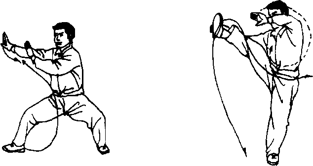 ② 此式较难做,对于自幼就学习的人,还是容易做到的。为了 适合年老体弱等不同的对象,适合在水泥地上或穿西装裤进行练 习,此式也可改为“摆脚下势”,就是在摆脚之后,将后阶段中的 一跌取消,改为右腿屈膝下蹲、左腿向前仆出的仆步,接做后面的