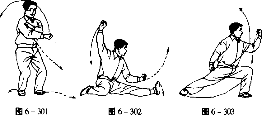 拳置于右臂上;右脚横摆后,自右下落,于左脚旁蹬地震脚,全身 气向下沉,左脚跟微提起(图6-301)。右腿屈膝下蹲,左脚脚尖 翘起,以脚跟贴地向左铲出,左膝里扣、松胯、合裆下沉,臀部、 右膝里侧和左腿后侧一齐贴地。同时,右拳经面前而上向右弧形举 起,拳心斜朝右上;左拳经右臂里侧而下随左脚铲出前伸,拳心朝 上(图6-302)。身体向前而起,蹬右腿,弓左腿,成左弓步。同 时,左拳以拳面向前上方冲起,拳心朝里;右拳转臂顺缠下落于右 跨旁(图6 - 303)。