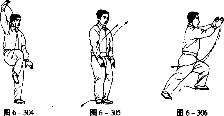 ① 前式跌叉弹起后(图6 - 304),即为此式做好准确。做好独 立的关键,在于提起腿的脚面应翊平,脚尖尽力朝下,以减轻腿的 悬垂杠杆重量;并以两臂上下左右分展、对拉来保持平衡,这样可 使身体达到稳定。