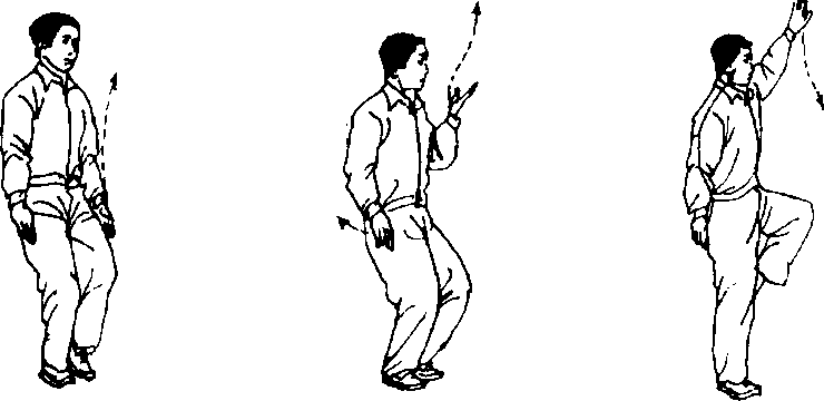1. 左独立势 重心全部移于左腿,身微左转,左腿起立, 左膝微屈,右腿提起,右脚面绷平,脚尖朝下。同时,两拳顺缠, 左拳自左前而上、右拳自右后向前而上,两拳在胸前交叉而过;随 着右腿将要提起时,两拳变掌,右手顺缠自右胸前上托,左手逆缠 下按(如图6- 308,惟左右相反);随着右腿提起时,右掌向右 上、左掌向左下逆缠展开,成左式金鸡独立(图6-304)。